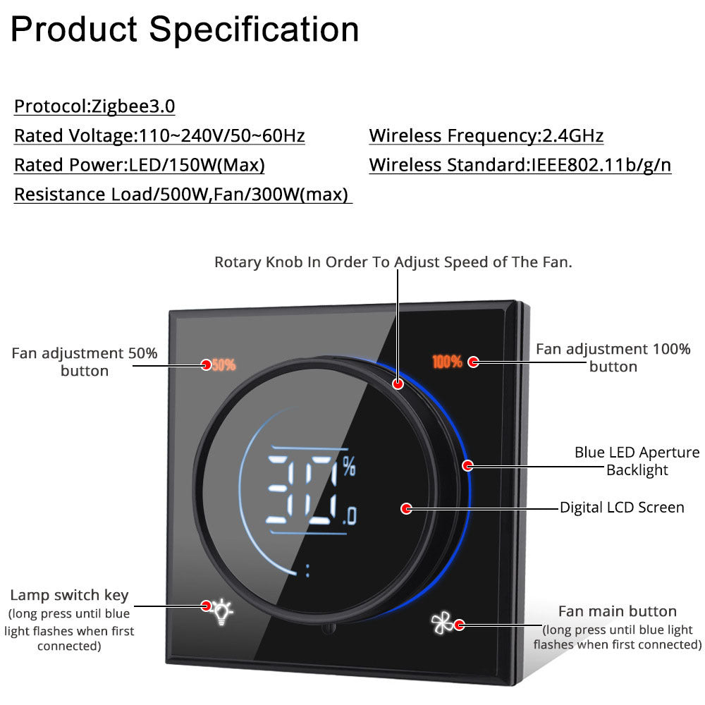 Breng sfeer, comfort en slimme bediening samen met deze moderne slimme WiFi dimmer. Dankzij het strakke glazen touch-paneel, de draaibare dimring met LED-indicator en volledige app- en spraakbediening is dit dé perfecte upgrade voor elke woning.